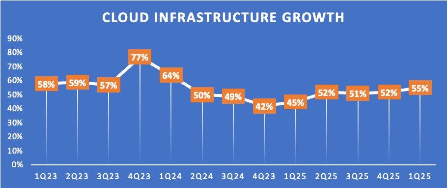 Included in this is Oracle’s infrastructure cloud revenue, which came in at $3.3 billion in Q1, up 54% YoY, despite lapping 46% growth in the same quarter last year. Furthermore, this represents an acceleration from prior quarters, up from 52% in Q1, and marks the best infrastructure revenue growth reported by Oracle in two years.