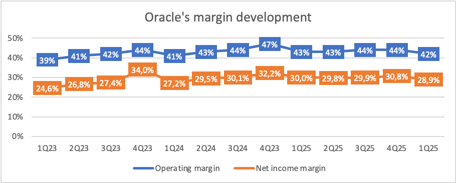 Moving to the bottom line, Oracle reported an operating income of $6.2 billion, up 7% YoY, growing slower than revenue as Oracle’s operating margin contracted. For reference, operating costs increased by 14%, driven by higher restructuring costs and a 39% rise in cloud costs. As a result, costs outpaced revenue growth, putting pressure on the operating margin, which contracted 100 bps YoY.
