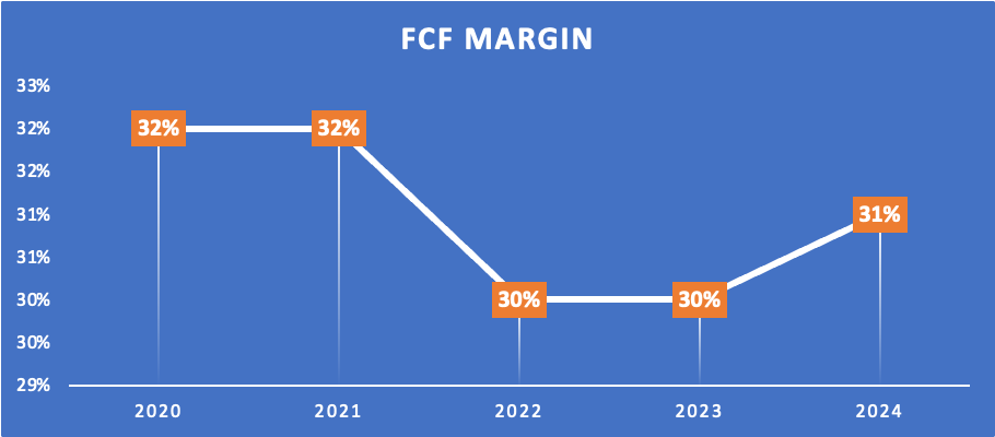 I know, 17% might not seem that impressive, but, as highlighted above, it is worth considering that FCF fluctuates heavily from quarter to quarter due to seasonal payments. Therefore, it is more valuable to consider annual FCF numbers, and as shown below, this has been sublime for NOW over the last 5 years, with a FCF consistently above 30% ($3.5 billion as of FY24).