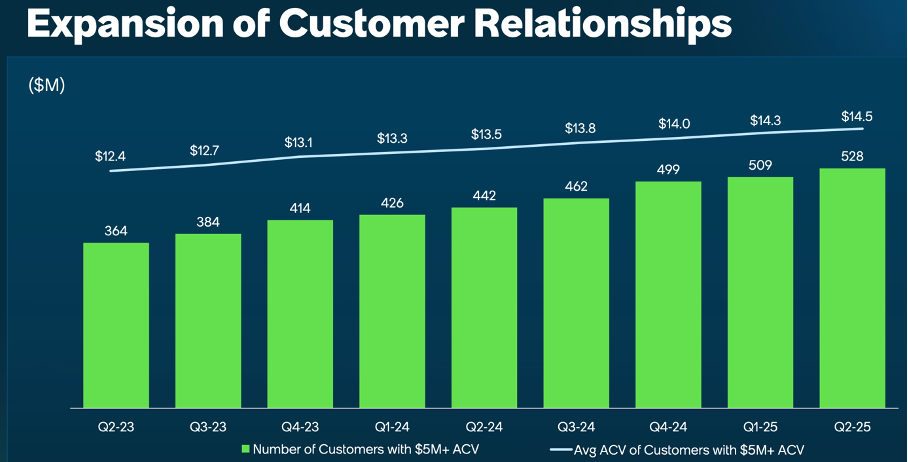 For reference, ServiceNow now has 528 customers generating over $5 million in ACV, and the number of customers contributing over $20 million has grown 30% YoY in Q2 and has tripled since 2021. This illustrates not only strong net new growth but also substantial expansion within existing accounts, driven by the platform’s increasing relevance across multiple enterprise functions.