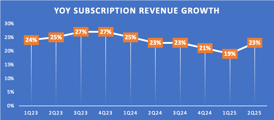 However, while the beat was nice, it was the growth acceleration that stood out. Despite NOW’s considerable size and some undeniable broader IT market headwinds, the company accelerated revenue growth in Q2, as highlighted above. In contrast, the expectation was for NOW's growth to finally drop structurally below 20% amid the aforementioned headwinds and its size catching up to it. Hence, this acceleration is a massive positive and a testament to the quality of the NOW platform.
