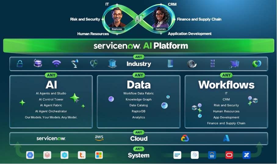 The NOW platform can operate with any AI model (including ChatGPT, Gemini, Meta’s Llama, or Claude), with any cloud provider (such as AWS, Google Cloud, Azure, or ServiceNow’s own cloud), and any database or system provider, thanks to prebuilt integrations and connectivity.