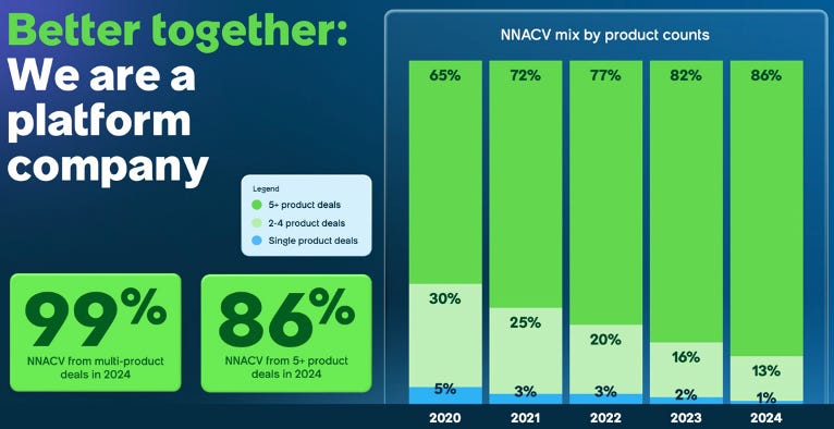 As a result, a whopping 99% of net new ACV now comes from multi-module deals. Furthermore, 86% comes from customers signing a contract for five or more modules, which is up from 65% in 2020, showing very impressive progress in customer adoption and average contract size, which is entirely driven by this incredible platform innovation and expansion.