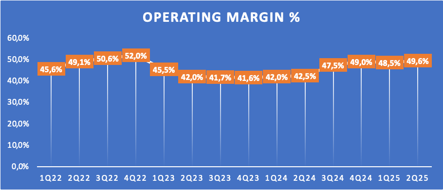 Moving further down the line, better operating leverage driven by rapid top-line growth and slower operating cost growth of 20% allowed for healthy operating margins expansion of 110 bps sequentially and 710 bps YoY to 49.6%, which are extremely strong margins.