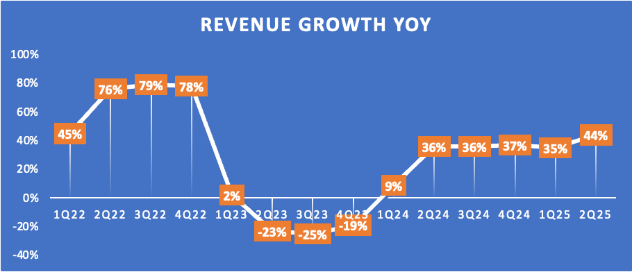 In Q2, revenue in USD grew another 18% sequentially and 44% YoY to $30.1 billion, handily beating management’s own guidance.