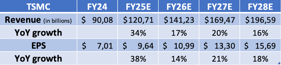 As for my projections, I have raised both my revenue and EPS projections for 2025 considerably following the Q2 outperformance and management’s confidence for H2, signaling no slowdown in demand. For FY26, I am slightly more cautious, as tariffs and global macroeconomic uncertainty may put pressure on demand, but I expect TSMC’s exposure to the AI expansion to enable it to continue delivering strong numbers. For FY27 and FY28, I expect growth to accelerate again.